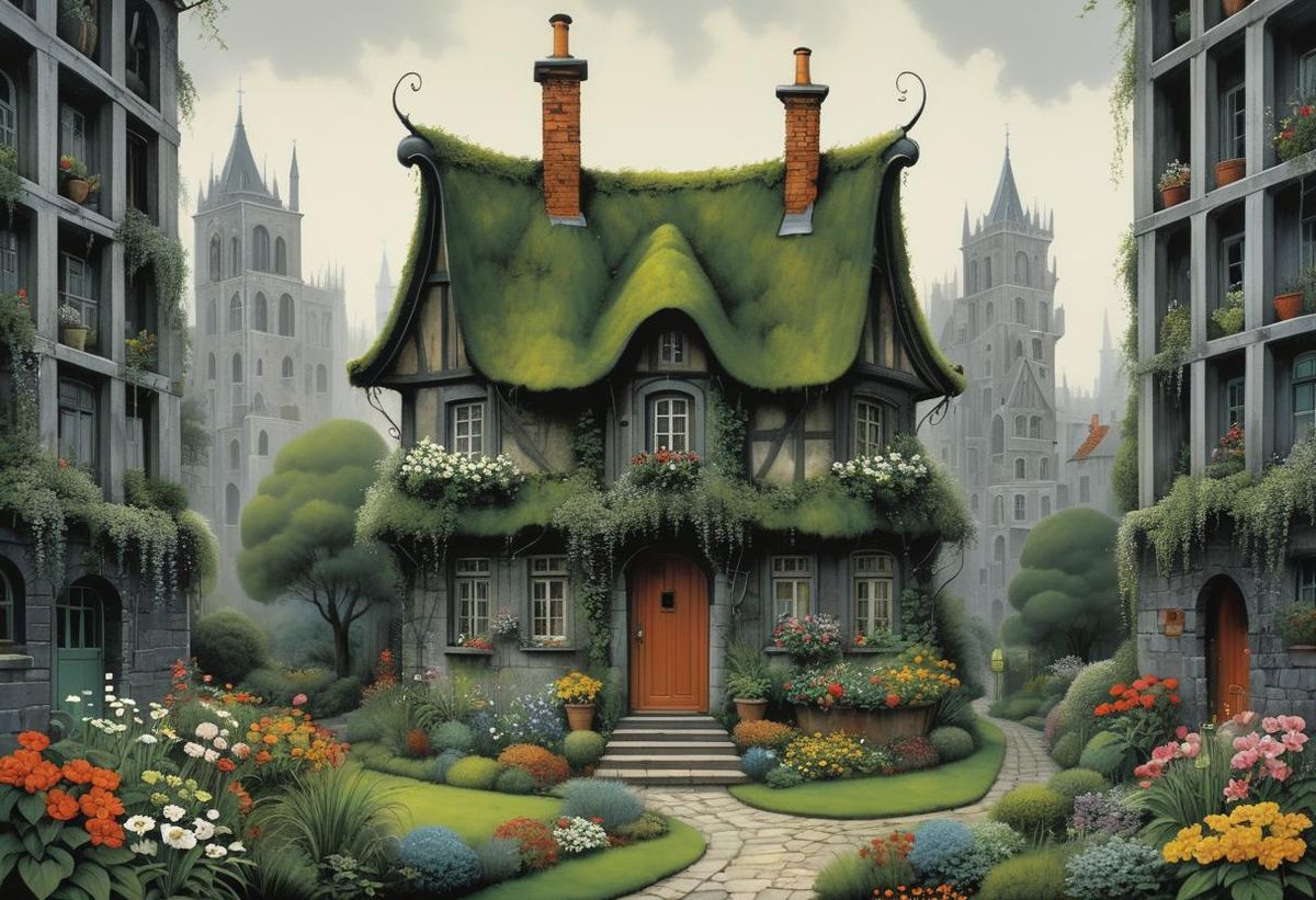 This image contrasts a lush, blooming garden with a gray, imposing city, highlighting the stark contrast between comfort and discomfort.