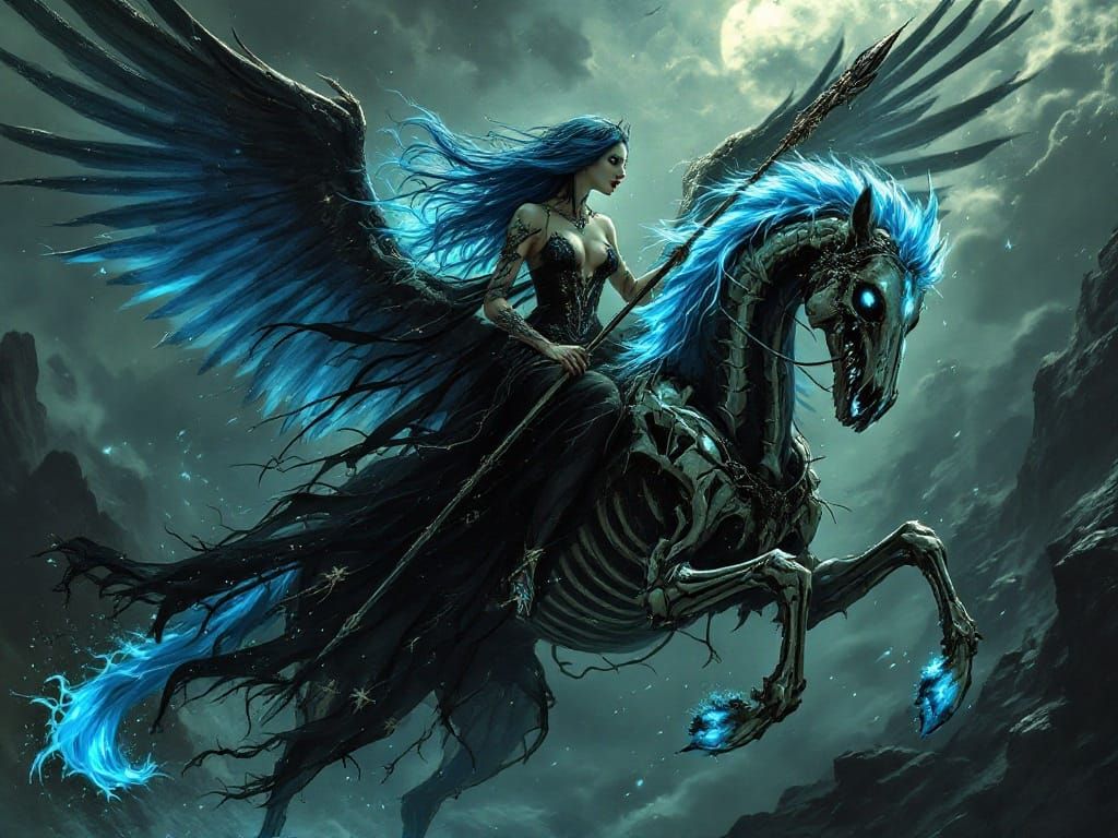 This image depicts a gothic valkyrie with electric-blue hair and glowing tattoos. She rides a skeletal pegasus through a stormy sky, wielding a raven-skull spear in an art nouveau style.