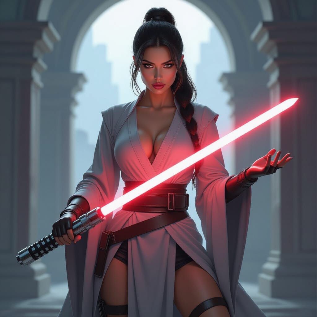 This image depicts a busty, voluptuous female Jedi Master in a tight, epic robe, holding a lightsaber in a combat stance. It features cinematic lighting and vibrant colors, rendered in a detailed fantasy art style.