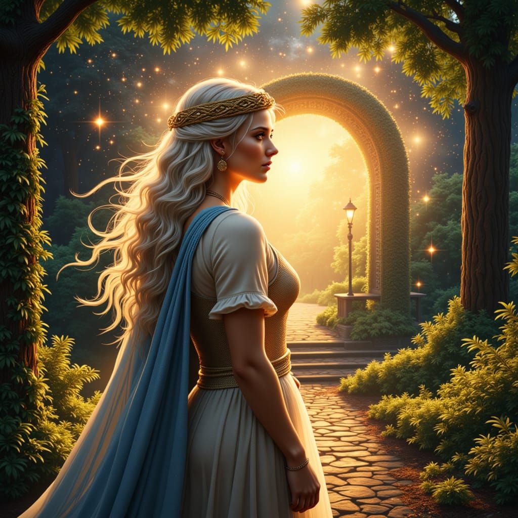 This image shows a cosmic wanderer with silver hair and golden eyes, wearing a crown of nebulae. The figure stands before a dimensional gateway in art nouveau style with iridescent light.