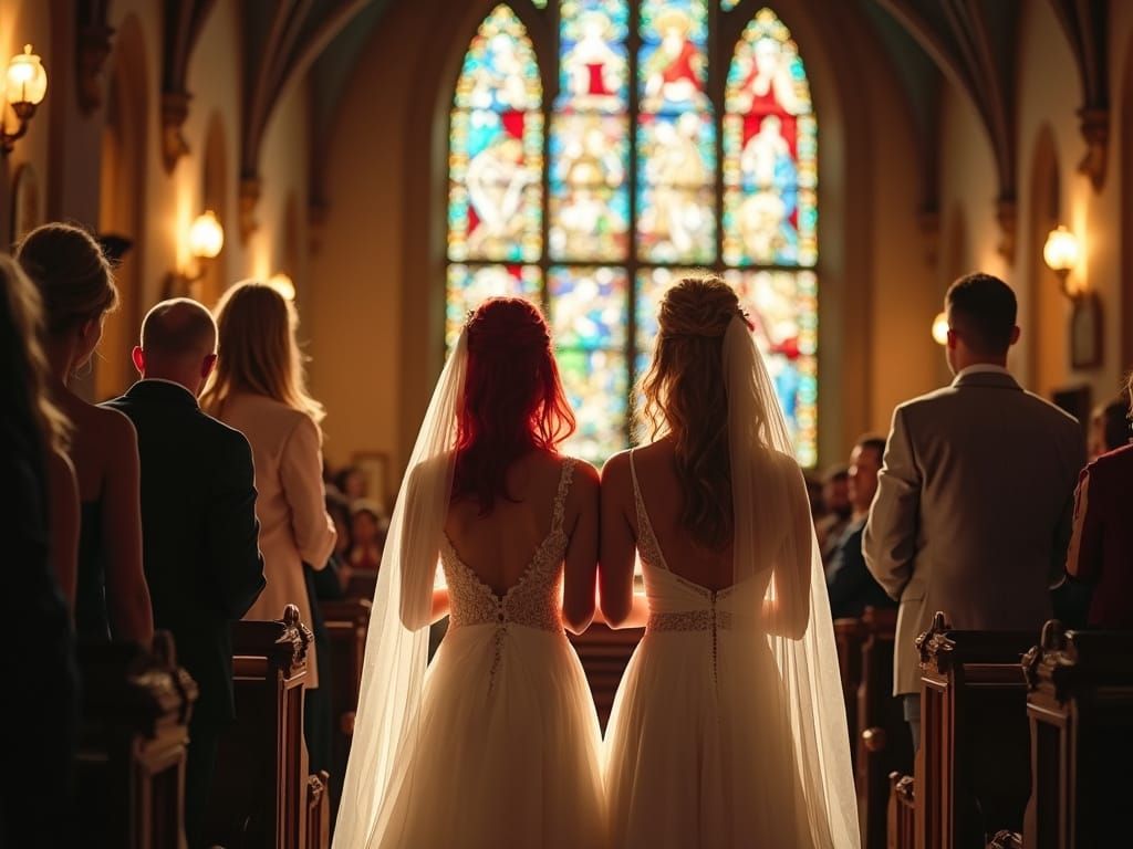 A striking picture of two brides exchanging vows in a gothic church. Stained-glass windows cast vibrant colors in a romantic realist style with an Old Hollywood aesthetic.