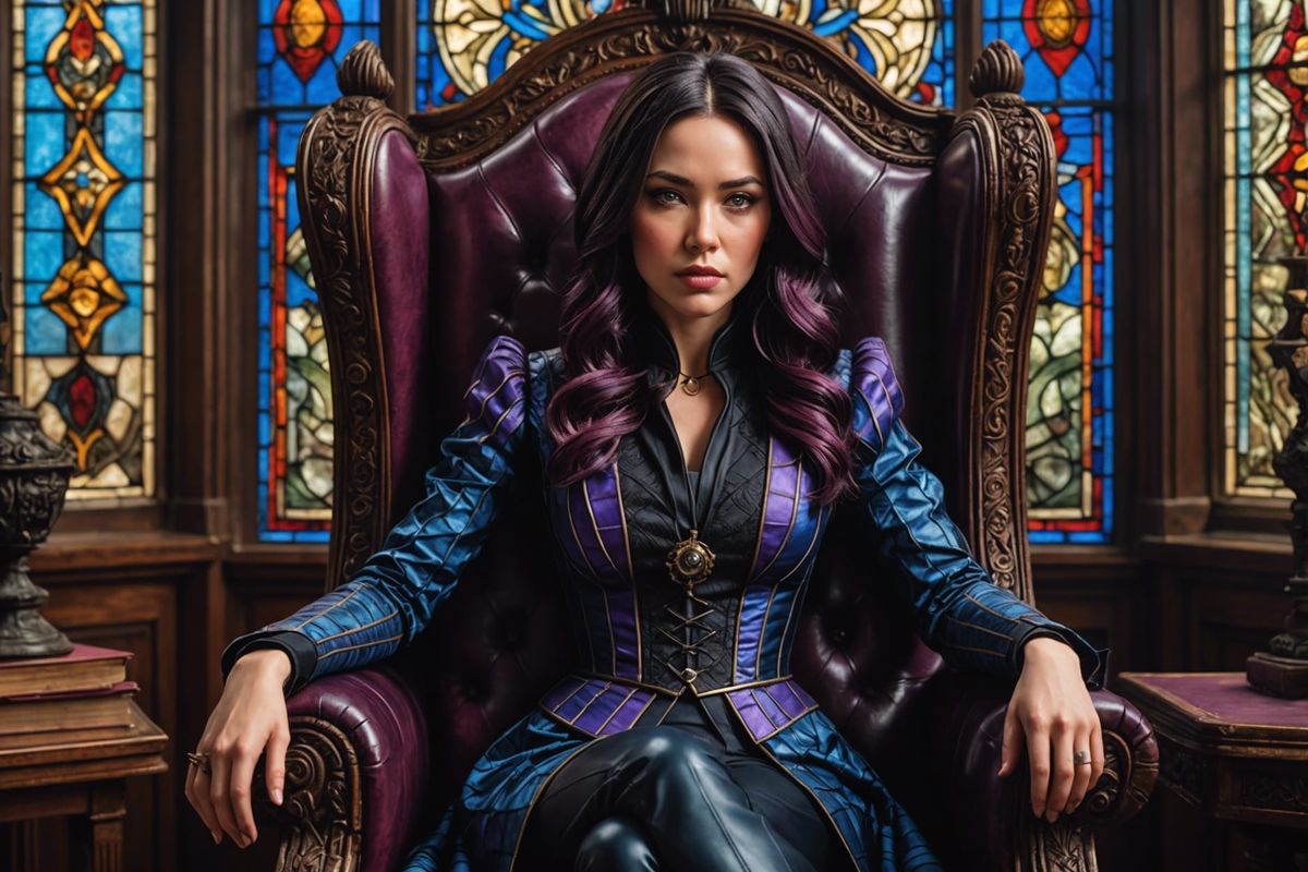 A striking picture of Psylocke depicted as a Victorian librarian reading in a maximalist library. The image is highly detailed and rendered with photorealistic textures, creating a dark fantasy aesthetic.