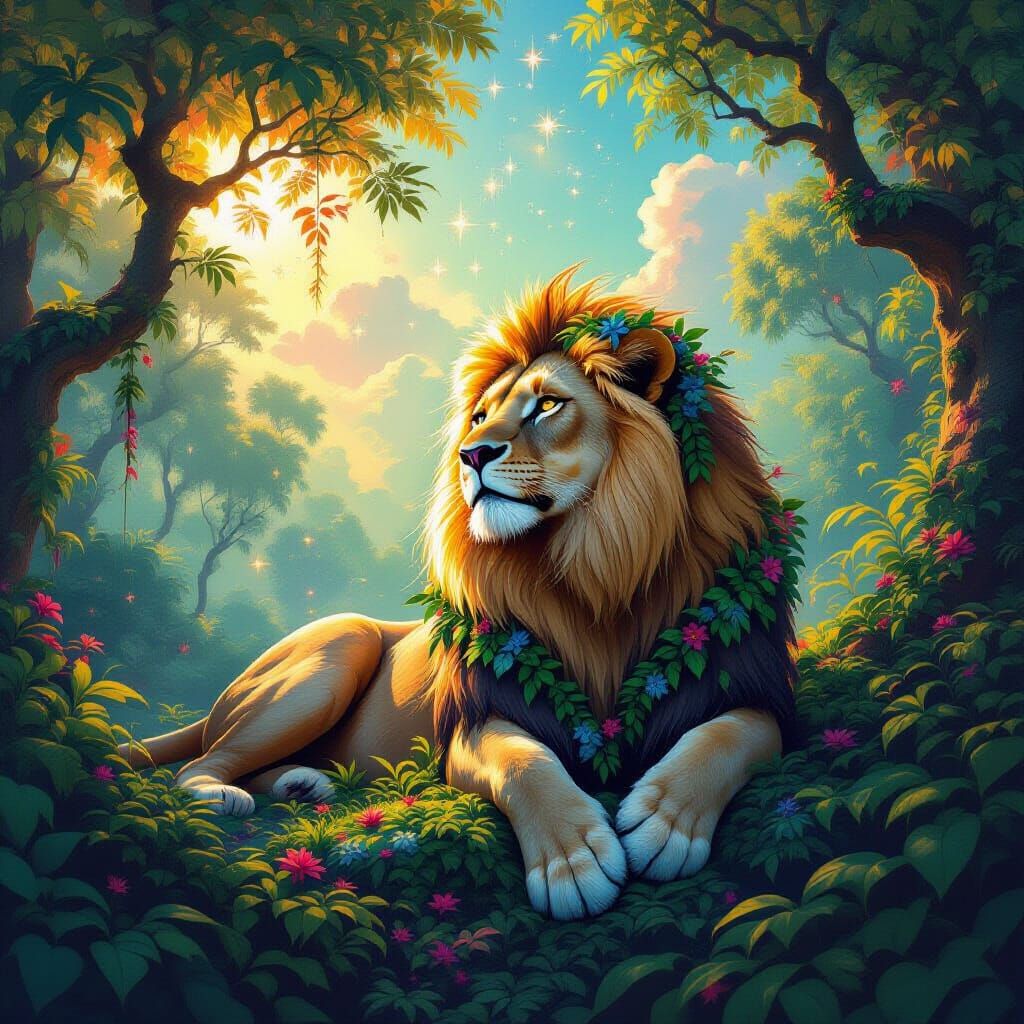 This image shows a stone lioness resting in a colorful jungle with floating trees. The scene blends warm daylight with a starry night sky, featuring glowing flora and a painterly, fantasy art style.