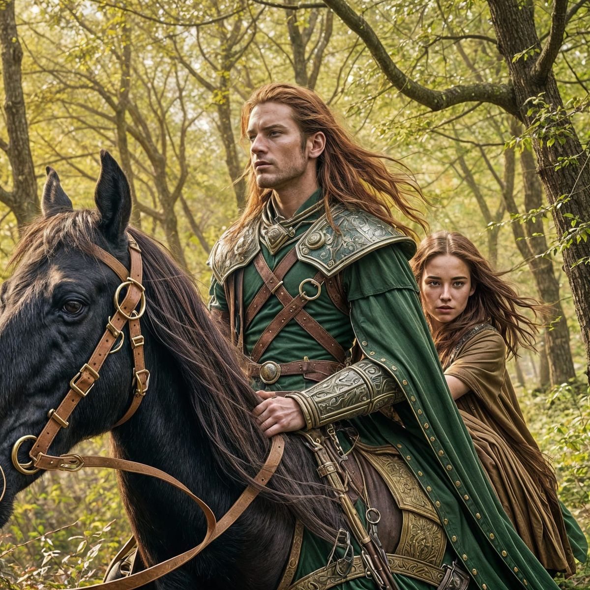 A majestic fae rider, Lucien, and his human friend, Feyre, flee through a lush Spring Court forest, surrounded by vibrant greenery and golden sunlight, as they navigate a moment of quiet urgency and complicated trust.