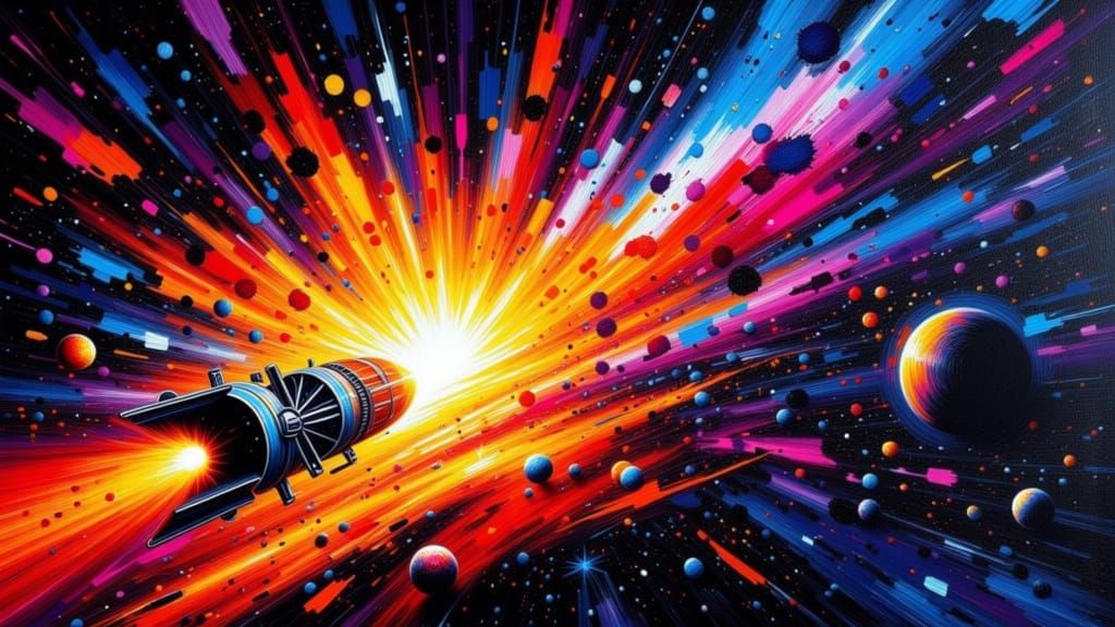 This image features a dynamic charcoal impasto sketch of a plasma-powered satellite observing a radiant exoplanet. Intense backlighting and vivid colors create a cosmic spectacle with textured, bold strokes.