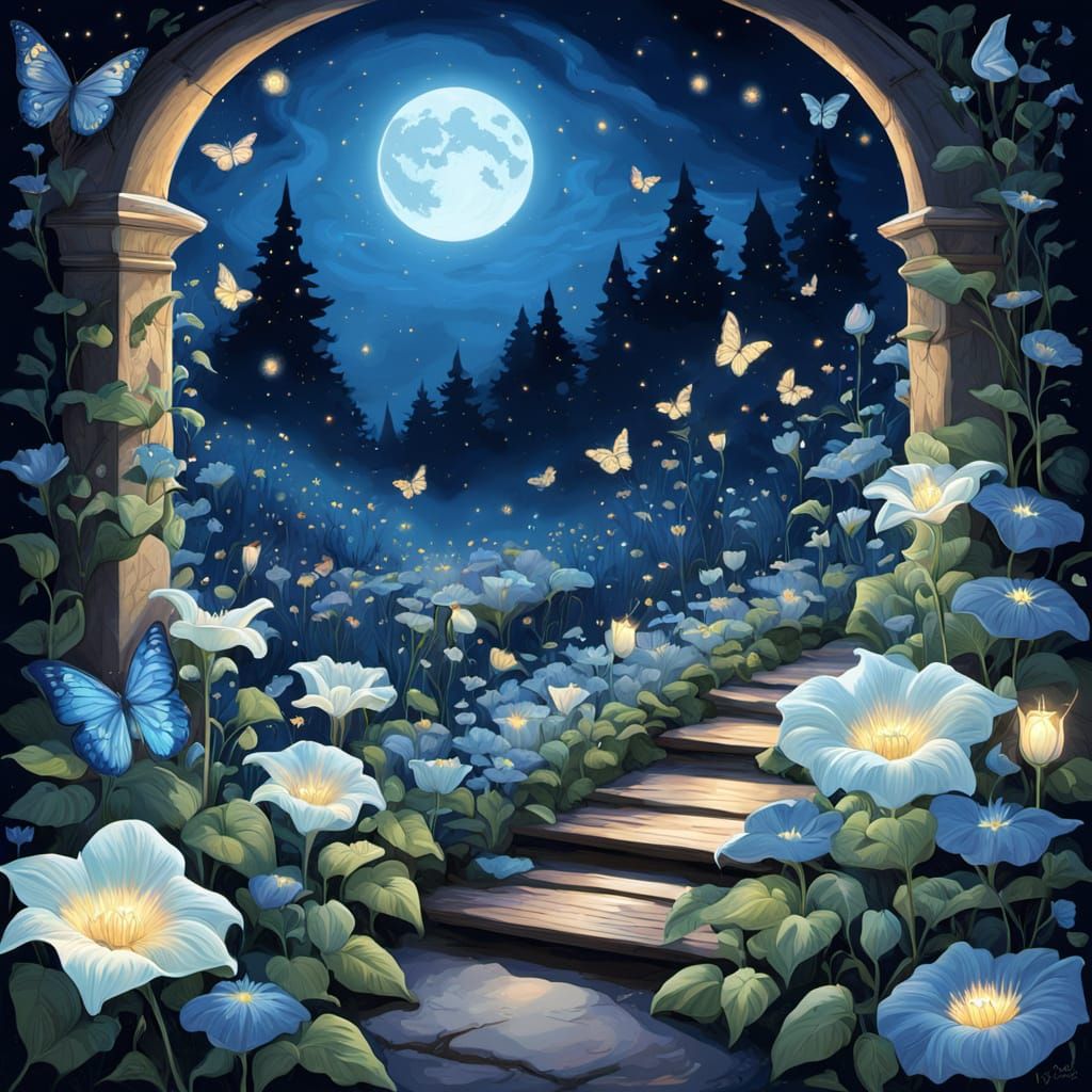 This detailed illustration showcases a magical garden at night, featuring glowing moonflowers on an archway and nocturnal blooms lining a stone path. Enchanted flora and luminous butterflies create an ethereal scene under soft moonlight.