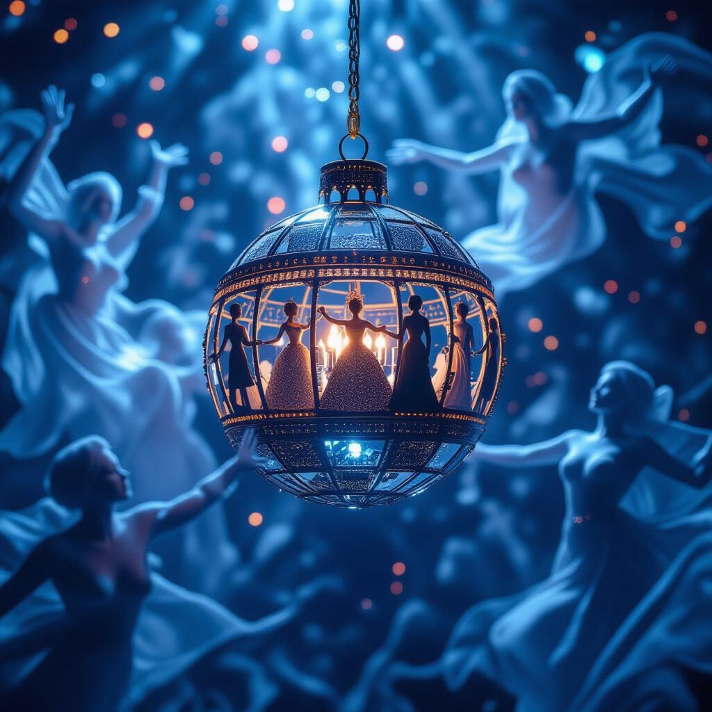 A photorealistic closeup of a detailed New Year's Eve ball, surrounded by spectral figures. Ethereal lights create a hauntingly beautiful scene with dramatic lighting and sharp focus.