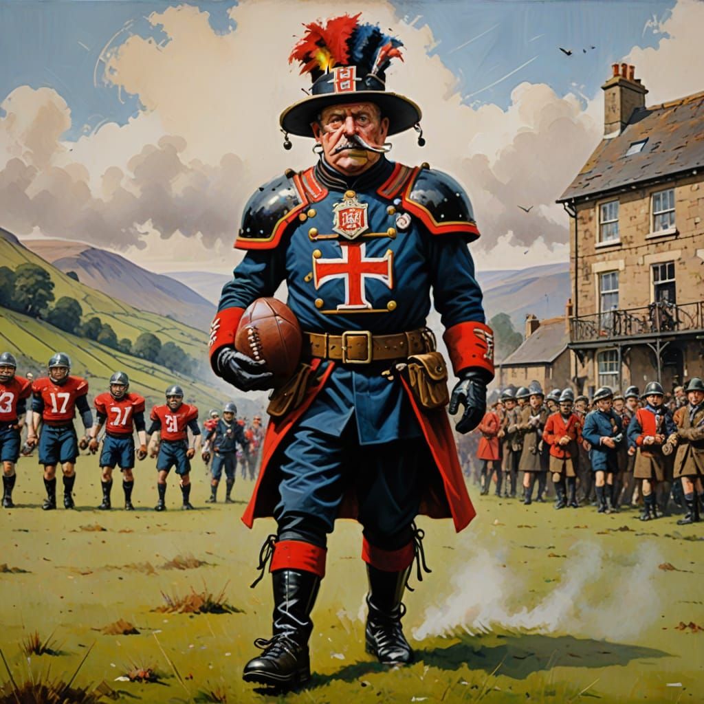 A digital painting of a Beefeater playing American football in the Scottish Highlands. The artwork has a steampunk aesthetic, reminiscent of street art.
