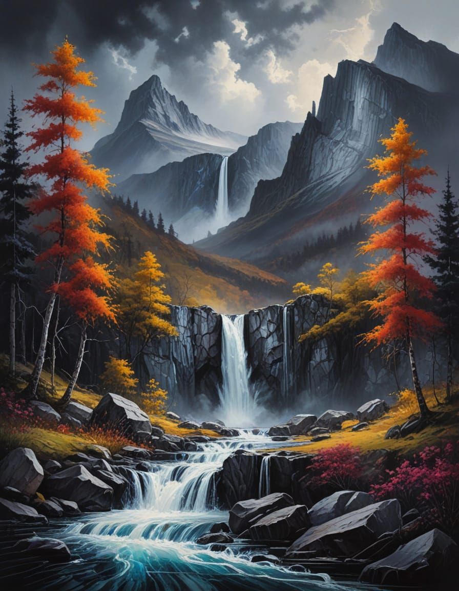 Easily generate colourful oil paintings of mountain waterfalls and moody skies with our free AI image generator.