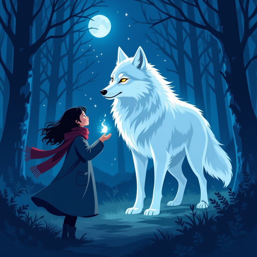 This image shows a young girl in a forest casting a Patronus spell. A majestic wolf formed of light protects her in the dark, ethereal scene, evoking dreamy fantasy art.