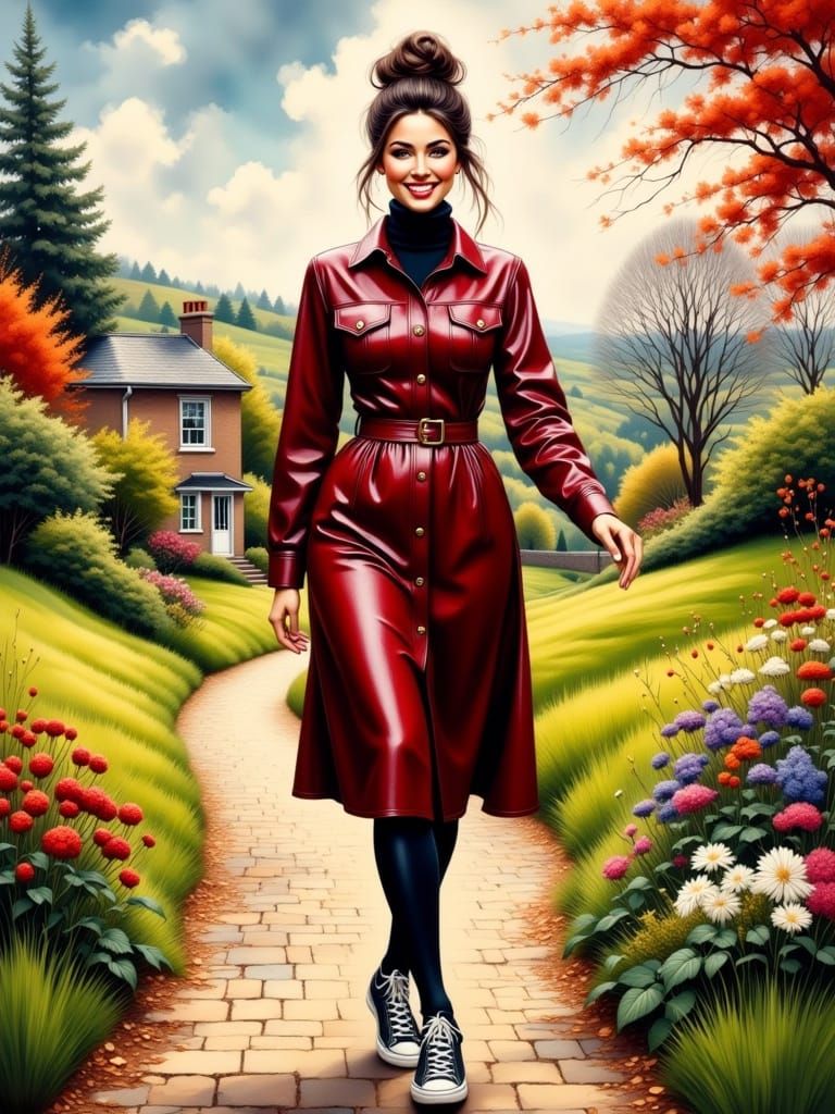 A striking picture of a brunette woman in a red dress walking in a landscape. This artwork blends lyrical lines and golden accents with vibrant hues, intricate ink textures, and layered brushstrokes.