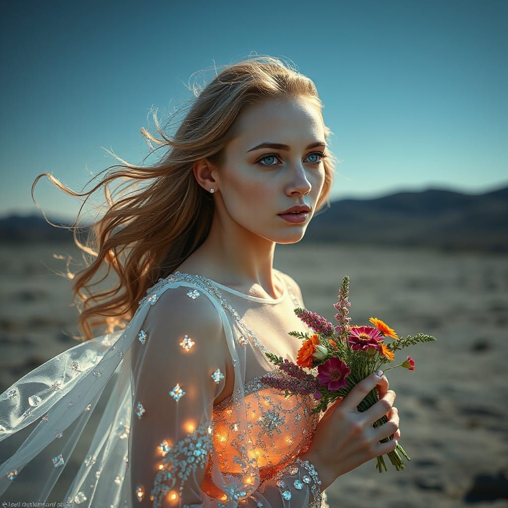 This image shows a woman with light brown hair and blue eyes in a starlight gown, in a minimalist landscape. She holds wildflowers and wears diamonds, rendered with hyperrealistic details and vibrant colors to create a cinematic mood.