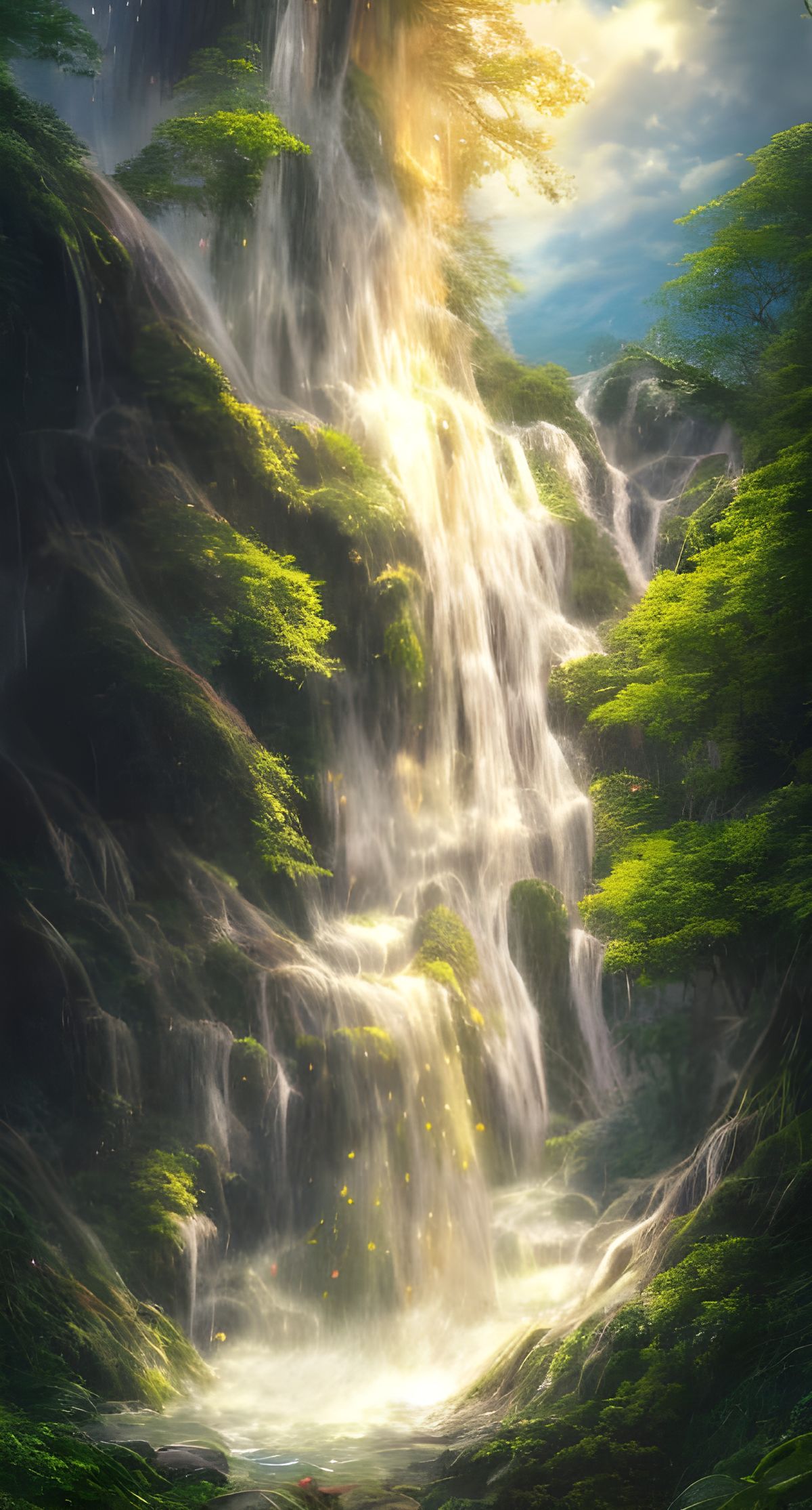 A hyperdetailed matte painting of ethereal waterfalls. The digital art evokes golden radiance and heavenly realms, enhanced by studio lighting and a whimsical composition.
