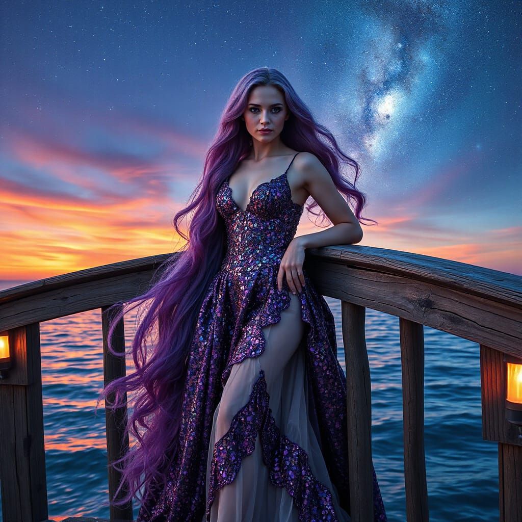 A cosmic scene featuring a woman with long flowing purple hair, intense gaze, glad in a dazzling galaxy themed gown, leaning gracefully against a rustic wooden bridge at sunset set against swirling galaxies in the sky. Scene is illuminated by soft twilight light, creating magical atmosphere. The bridge ...