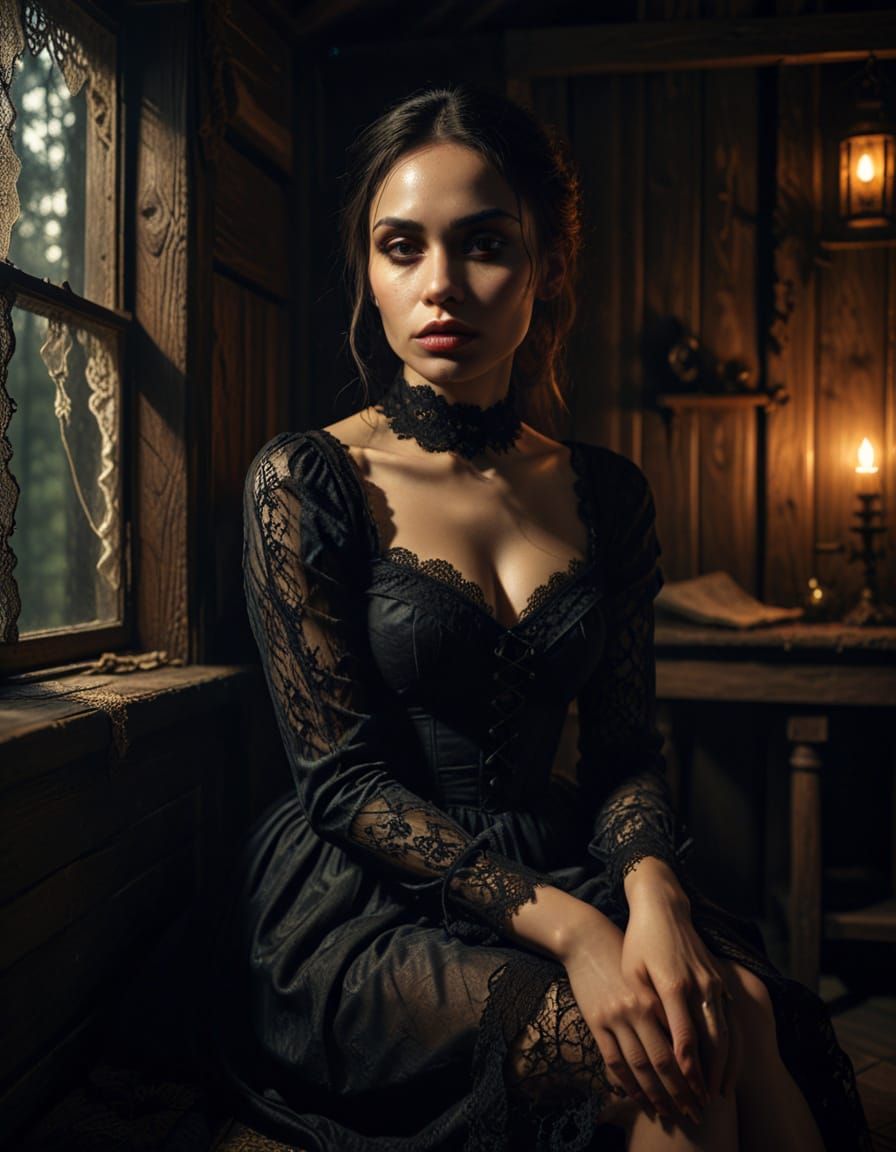 This image shows a half-body gothic portrait of a 22-year-old Dominican woman in a dark, romantic cabin setting. The image features velvet shadows, pale skin, and dramatic lighting, in a dark romanticism style.