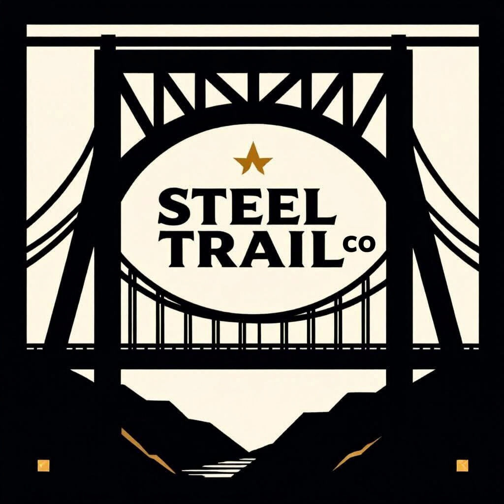 This image shows a minimalist logo for Steel & Trail Co. in flat vector style. The design features industrial typography, clean black and white tones, a gold accent, and a subtle geometric bridge arch icon.
