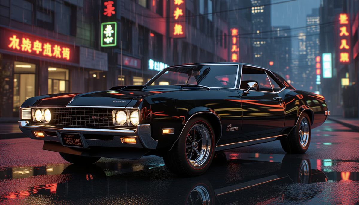 A highly detailed 3D rendering of a black and copper 1968 Buick Riviera GS in a noir city. This tuned muscle car features a cyberpunk aesthetic.