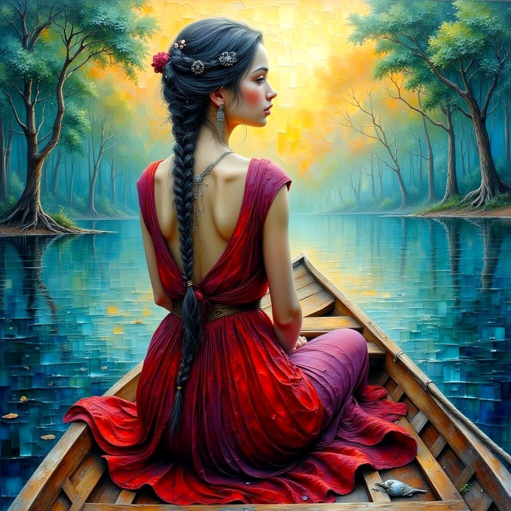 This image shows a modern boho woman in a boat, enjoying the rain. The impasto oil painting style is evident through hard brush strokes and textured craquelure, enhanced by magical lighting.