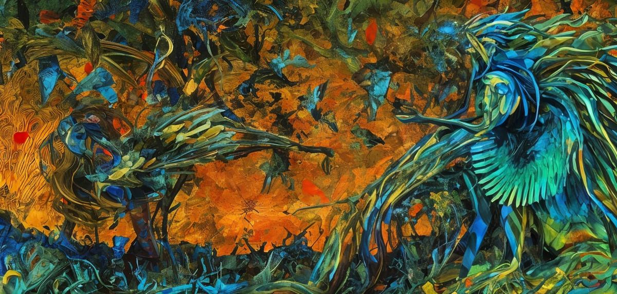A surreal image of a woman kneeling during a sunset. This bio art collage features glowing creatures and intricate networks of birds, offering a poetic expression of environmental connection and feminine identity.