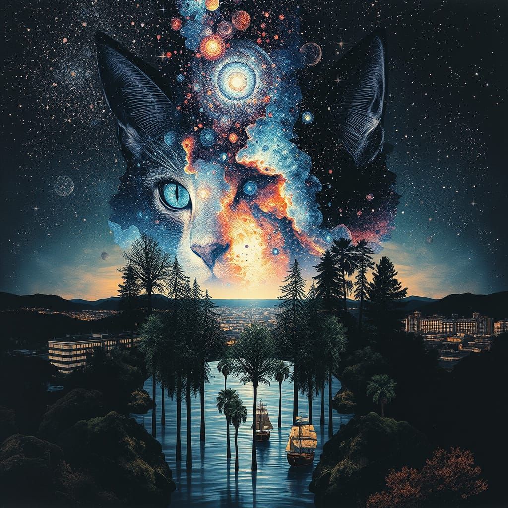 This image shows a surreal double exposure of a galaxy dripping into a world of intricate details, including trees, cities, stars, oceans, and sailing ships, with a silhouette cat head in the foreground, created in a maximalist aesthetic.