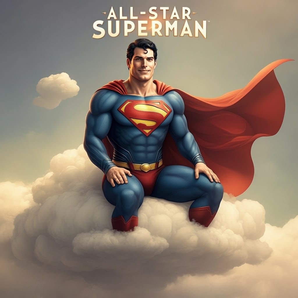 This vibrant comic book illustration captures Superman sitting confidently on a soft, white cloud, his cape flowing behind him in dynamic movement. The bold, colorful title 'All-Star Superman' adds to the sense of heroism and action, as if Superman is ready to take flight.