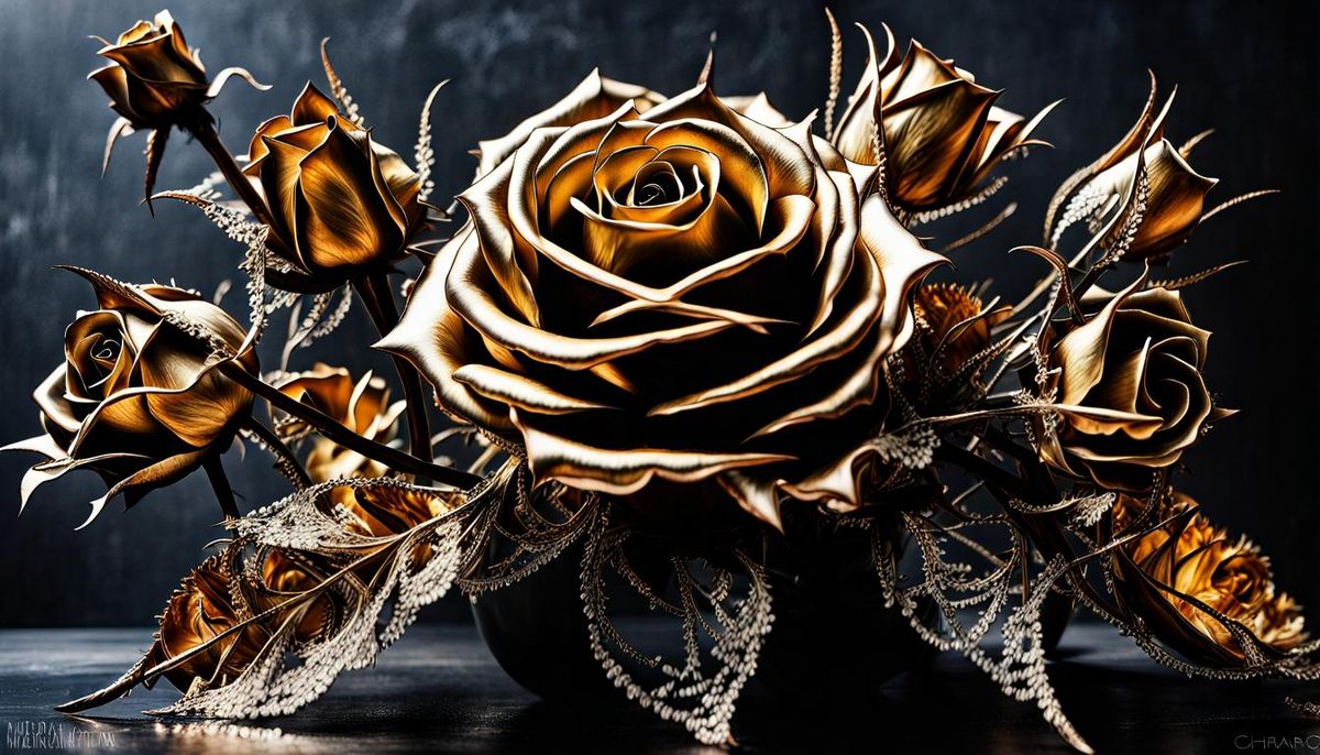 A captivating image of decaying platinum and gold roses in a dark fantasy setting. The bouquet features metallic elements, intricate details, and a mystical aura, as 3D rendered digital art.