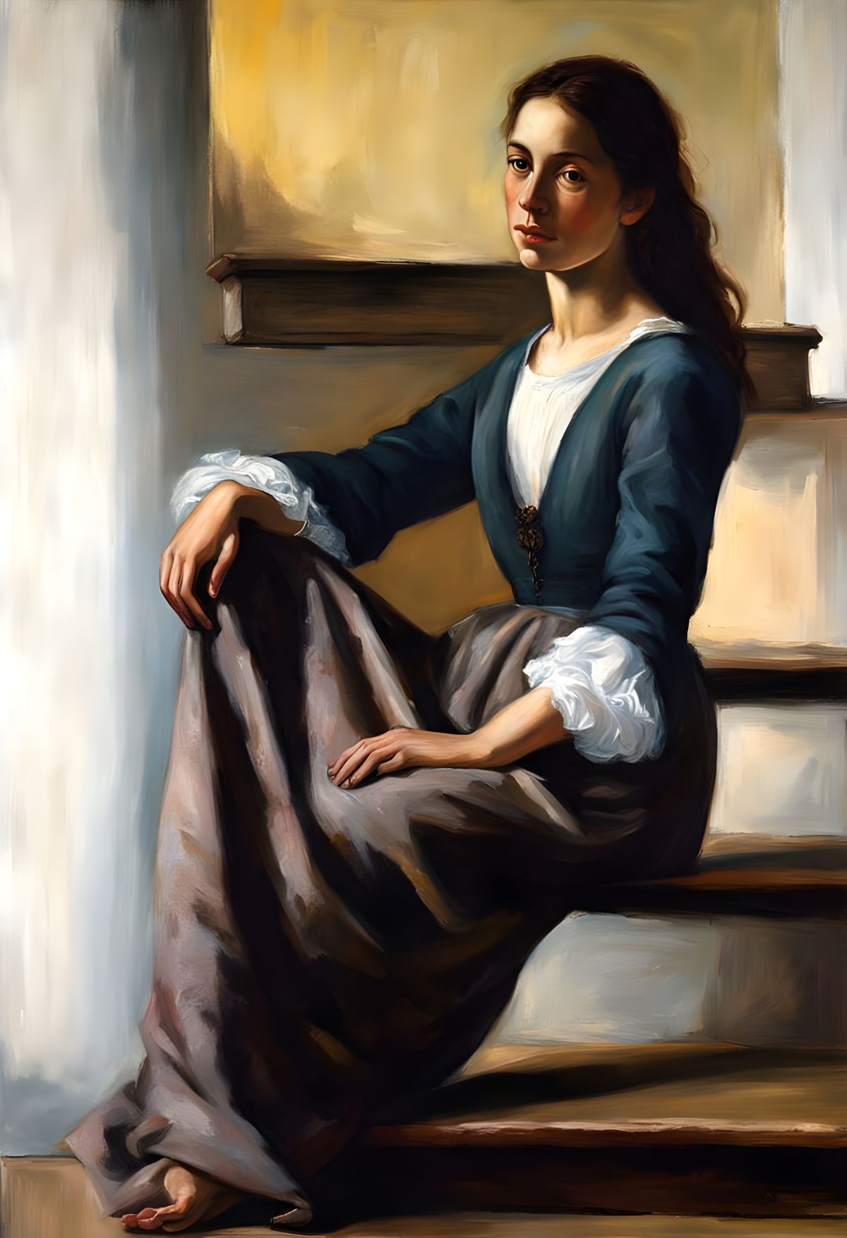 This portrait shows a young woman in a serene outdoor setting, surrounded by the natural beauty of a rustic wooden porch. Soft sunlight and gentle shadows create a warm atmosphere, as she sits in contemplation, lost in thought.
