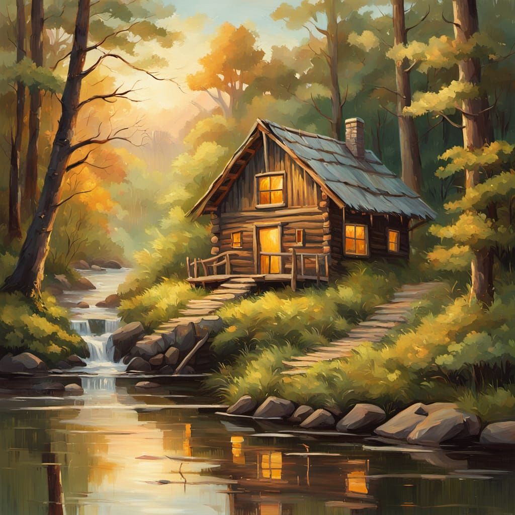A charming image shows a raccoon's cabin nestled near a riverbank, rendered in an impressionistic style. The oil painting features thick brushstrokes, warm light, and vibrant, earthy tones to create a serene forest scene.