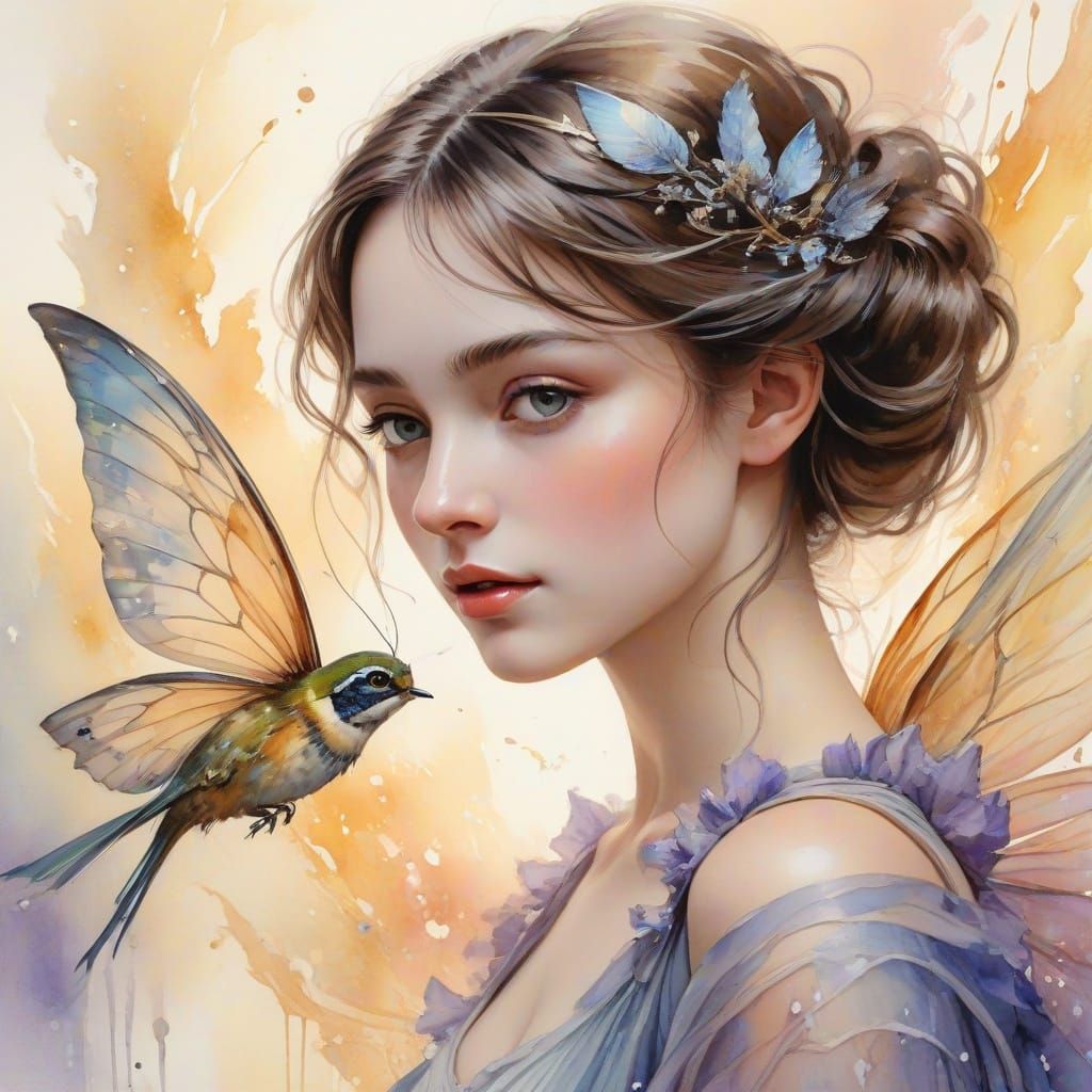 This watercolor illustration features a close-up portrait of a fairy surrounded by shattered glass, set against a soft, impressionist background with delicate patterns and intricate details. Ethereal colors and warm, golden light create a whimsical and dreamy atmosphere, reminiscent of Beatrix Potter's c...