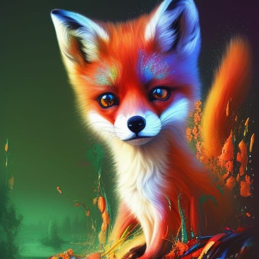 A vibrant image of an adorable chibi fox with large, reflective eyes. The artwork features a colorful, highly-detailed splash art style with elements of oil and gouache techniques.