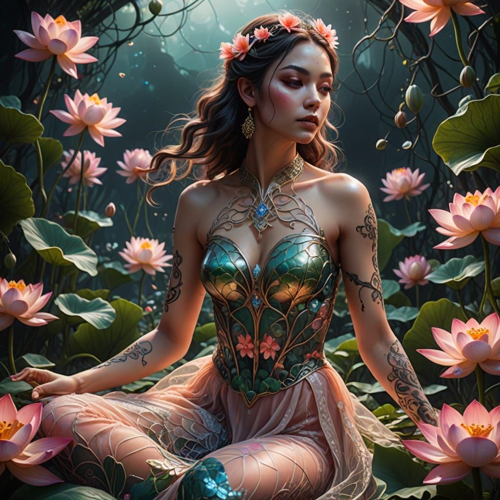 A captivating image of a woman in a peach lace dress, lying down with glowing skin. The artwork is a hyper-realistic scene with dynamic flowers, deep colors, and intricate details in a fantastical style.