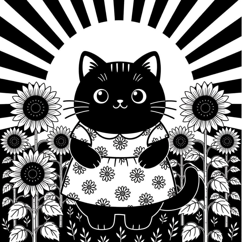 This image is a black and white coloring sheet featuring the cartoon cat Pusheen in a floral dress, surrounded by sunflowers with a sunset background. Designed in a children's book illustration style.