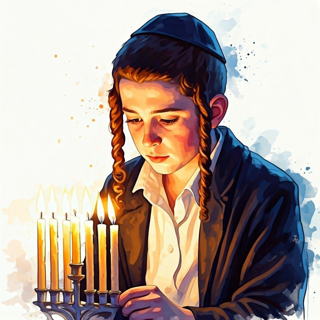 This image shows a watercolor portrait of a Hasidic boy lighting Hanukkah candles. The artwork features loose brushstrokes, ink splashes and color bleeds against a white backdrop in a neo-expressionist style.