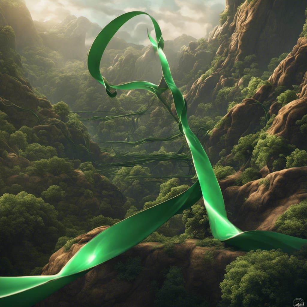 A detailed matte painting of a Kelly green ribbon representing bile duct cancer awareness. The image features deep colors, intricate details, and a fantastical concept art style.