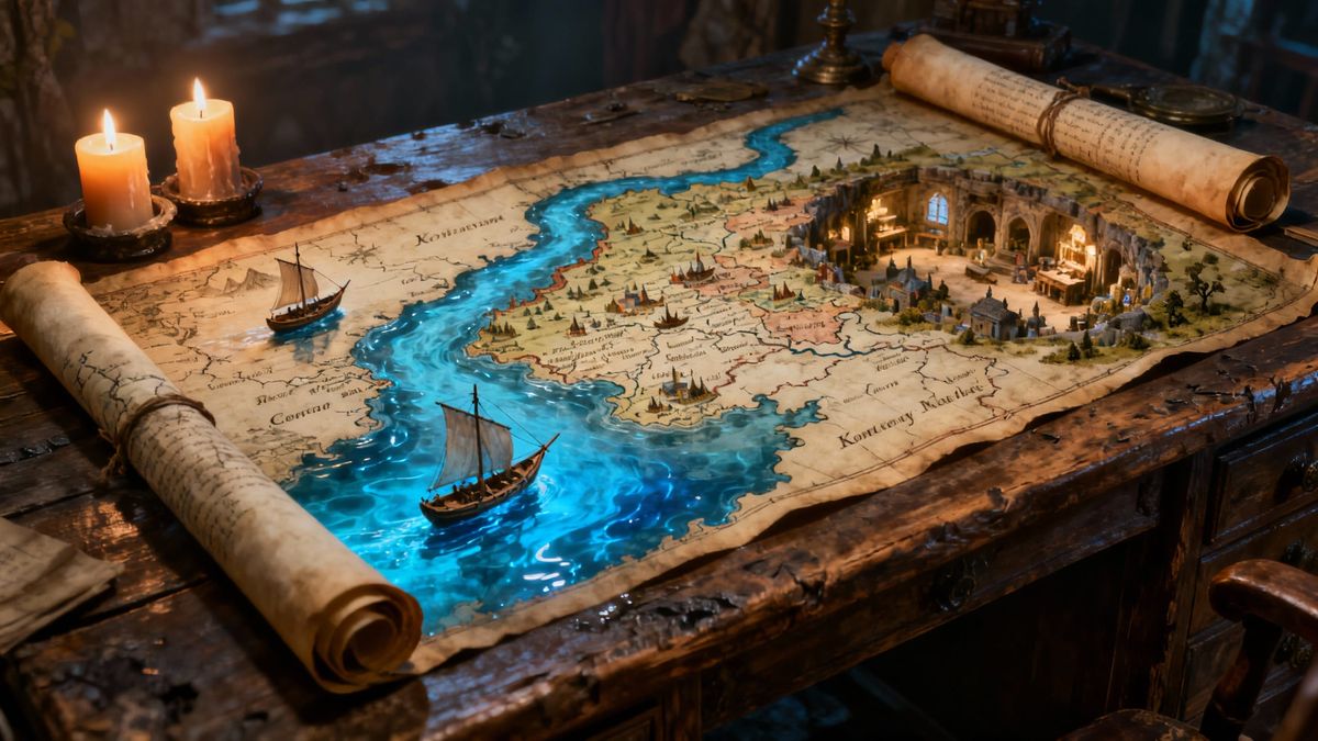 This hyperdetailed fantasy artwork depicts an antique map with sailing boats and a miniature kingdom on a gritty wooden desk, illuminated by dramatic lighting.