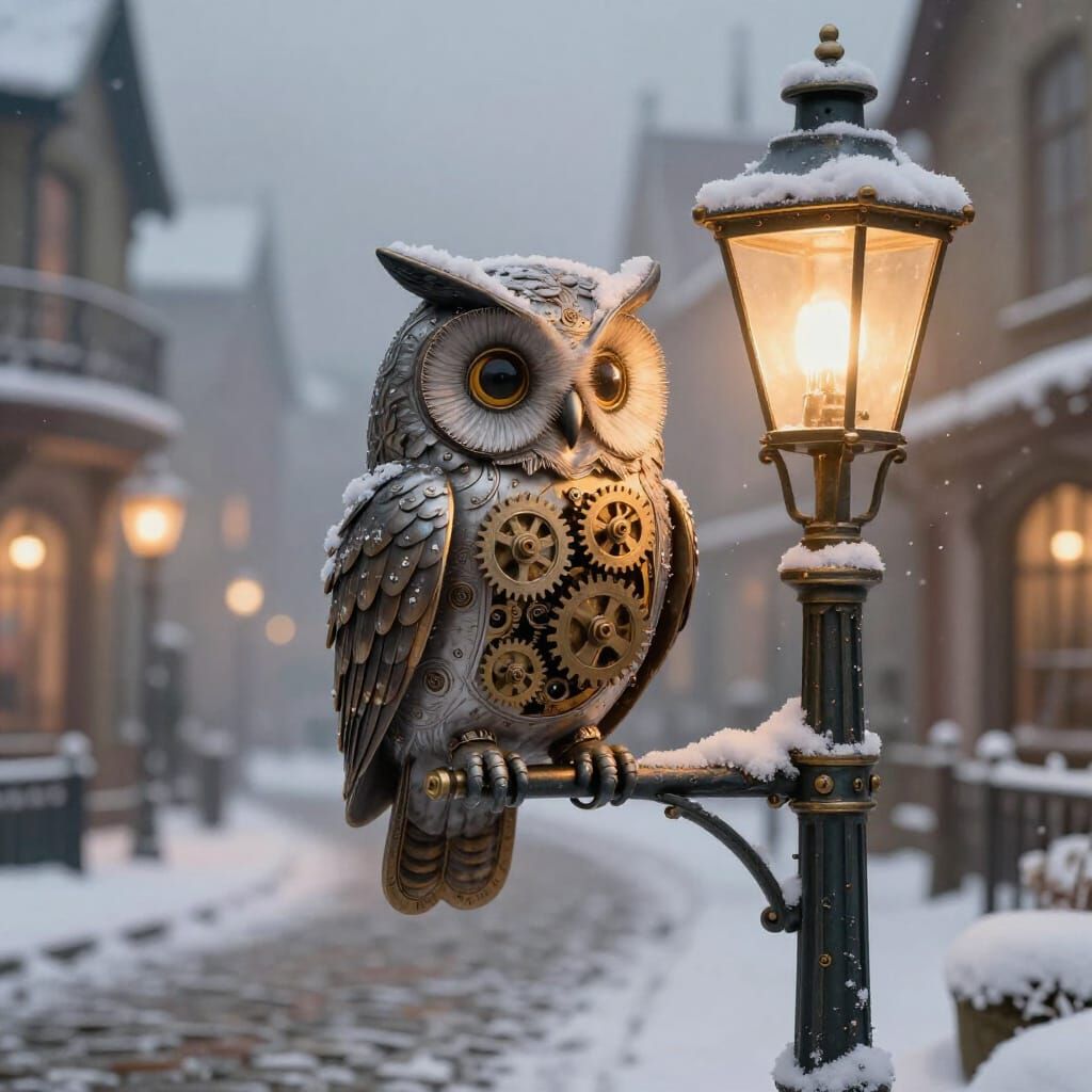 A whimsical clockwork owl perches on a snow-covered Victorian lamppost, its gears softly illuminated by the warm glow of gaslight.