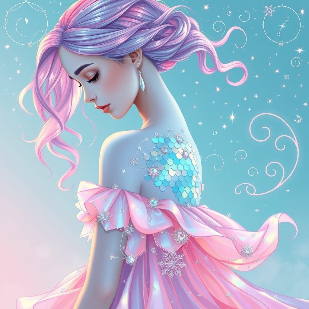 This image features a young princess with delicate features and a flowing, pastel-hued mane, wearing an iridescent gown made from shimmering fish scales and adorned with intricate constellations, set against a soft, gradient background evoking a sunrise over the ocean with swirling patterns and celestial...