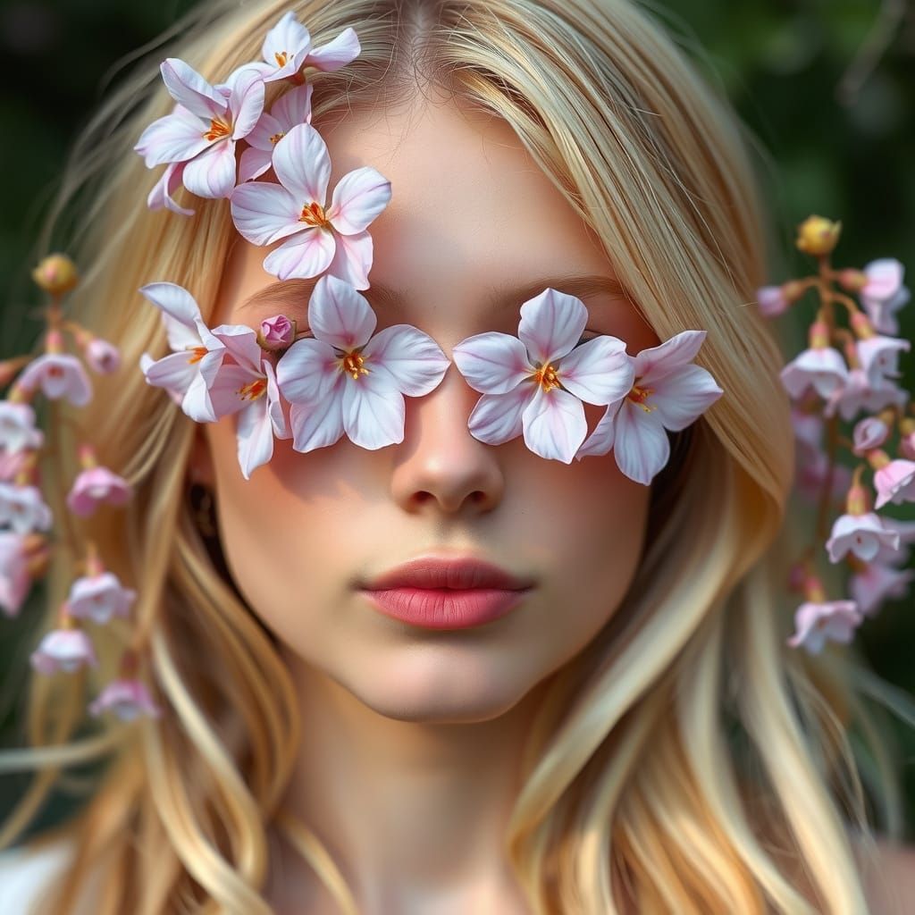 This image shows a serene woman with delicate flowers as her eyes, surrounded by a peaceful background. Her long, flowing hair is adorned with flowers in soft hues of purple and white, creating a dreamlike atmosphere.