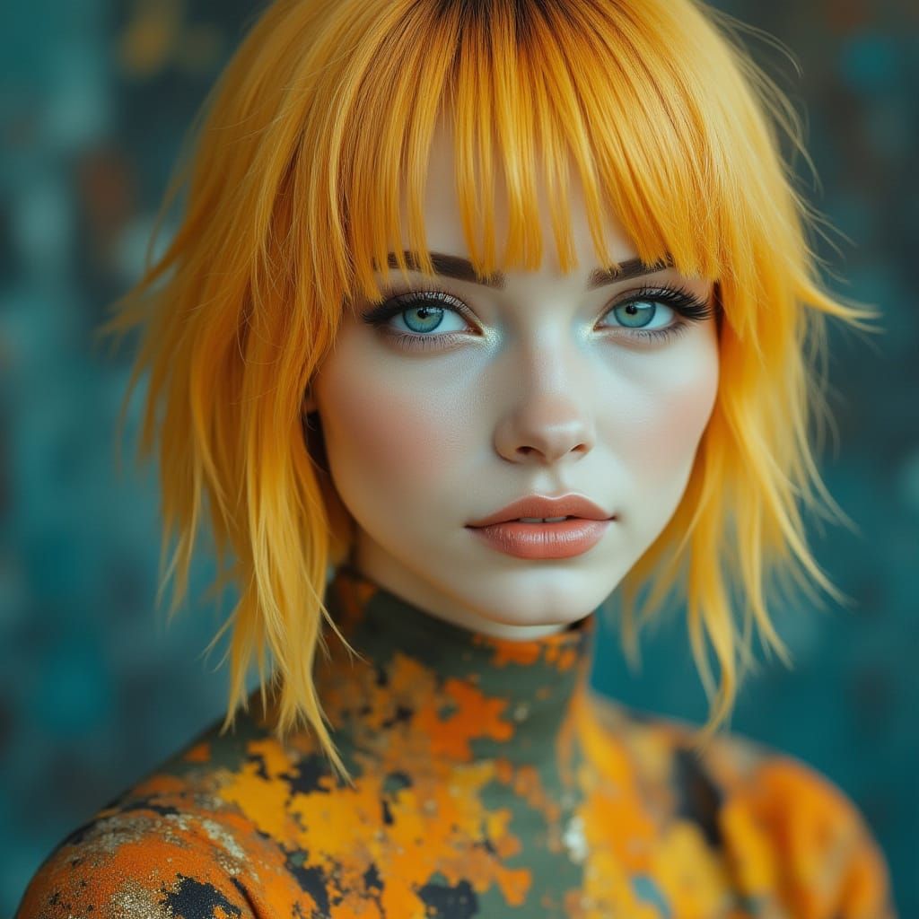 A detailed portrait of a woman with a samurai haircut and tie-dye clothes, featuring vibrant amber, yellow, teal, and tangerine colors. The image has sharp focus and intricate details, with soft, glowing eyes.