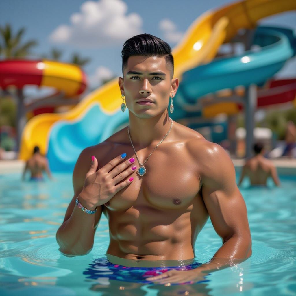 This image shows a confident Navajo Two-Spirit man in a vibrant swimsuit at an aquapark. The character stands six feet tall and is rendered with dynamic textures and vibrant colors in a contemporary style.