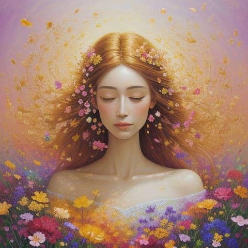 A vivid oil painting of a woman surrounded by glowing flowers. The surreal image features shimmering petals and gentle blooms, rendered with delicate brushstrokes and a warm, golden light.