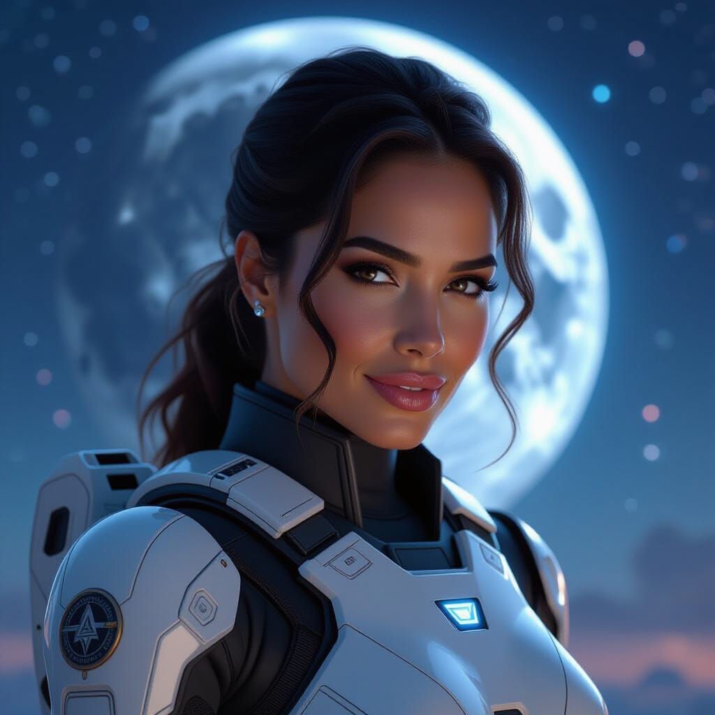 This image shows a close-up portrait of a sensual IDF soldier with a subtle smile, set against a cosmic backdrop of the moon and Milky Way. She is wearing a high-tech exosuit, with Art Nouveau-inspired ornaments in an 8k resolution.