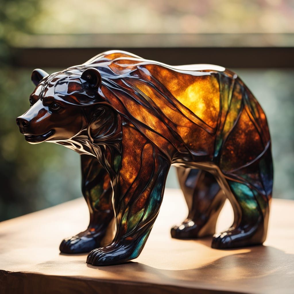 This image shows an obese Kodiak bear sculpture crafted from shimmering pyromorphite glass. It features intricate Art Nouveau details and a rich, jewel-toned color palette, evoking an 1880s aesthetic.