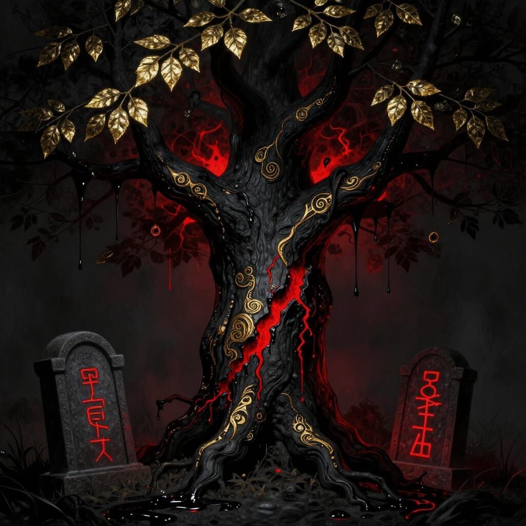 This digital matte painting features a stark black tree with gold filigree bark, diamond leaves, and glowing red energy from its cracks. Viscous black sap drips, with an ancient grave at its base. It has a dramatic, ominous atmosphere.