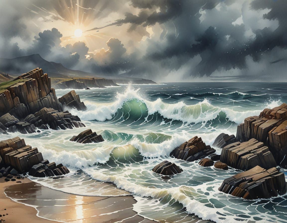 A highly detailed, professional watercolor painting of a stormy sea crashing against rugged coastal rocks. Dark heavy clouds Ocean is wild and powerful, large crashing waves, foamy water, and turbulent movement Water splashes against the rocks, which are painted in layered earthy tones. The watercolor ...