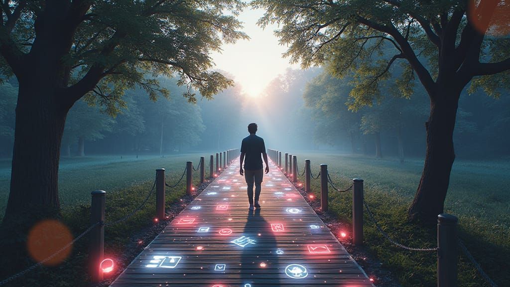 This image juxtaposes the chaos of digital life with the tranquility of nature, featuring a person escaping a sea of social media icons and glowing notifications to find peace on a serene wooden bridge, surrounded by vibrant flora and fauna, in a stunning hyper-real painting style reminiscent of fantasy ...