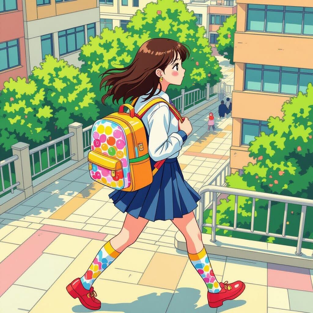 This image shows a Korean woman in a university uniform with a jelly backpack and thick jelly socks. The vibrant colors and whimsical details create a playful, cartoonish aesthetic.