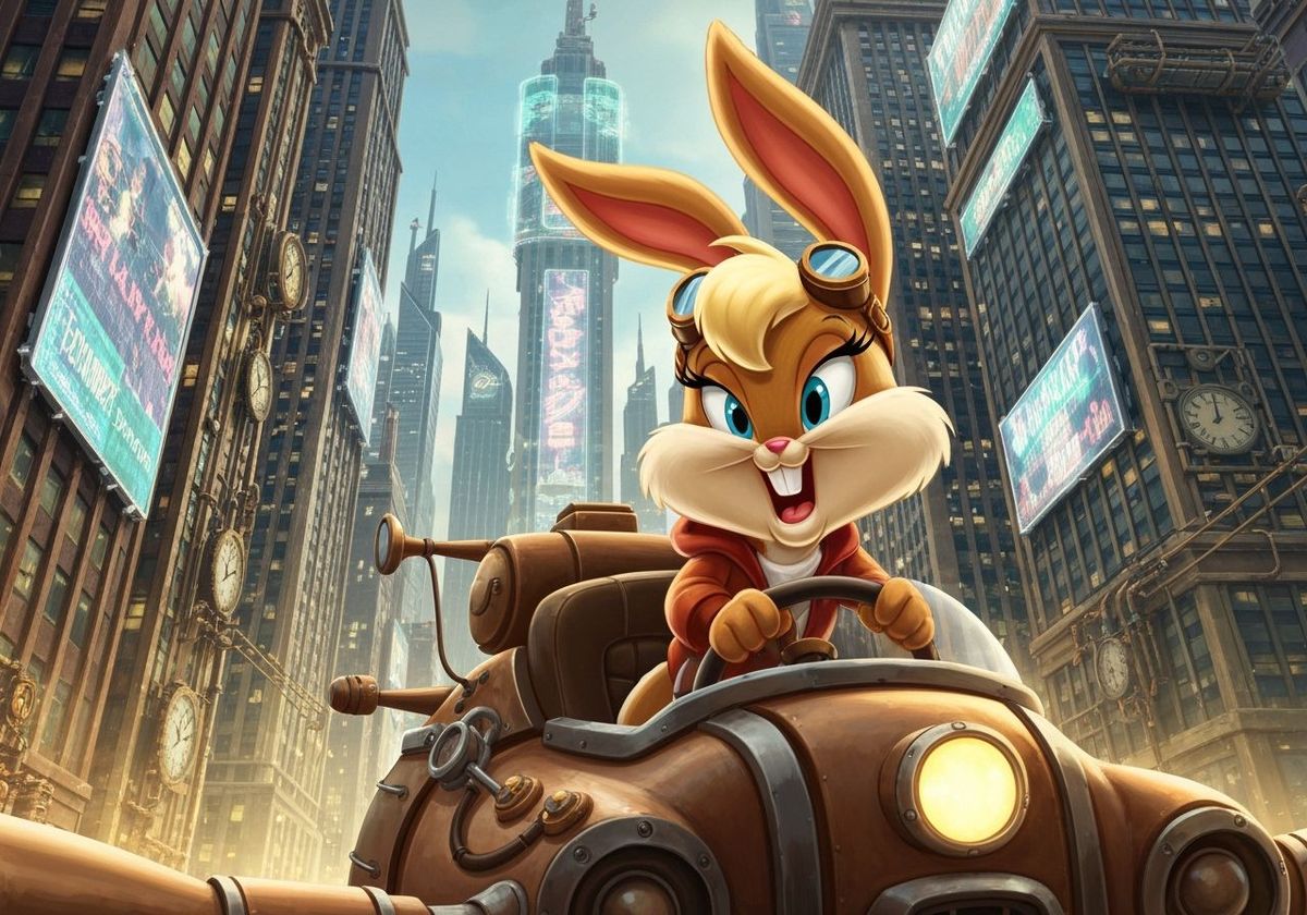 This image depicts Lola Bunny in a steampunk hovercar, cruising through a retro-futuristic New York City. Towering clockwork skyscrapers and holographic ads create a nostalgic technological dreamscape.