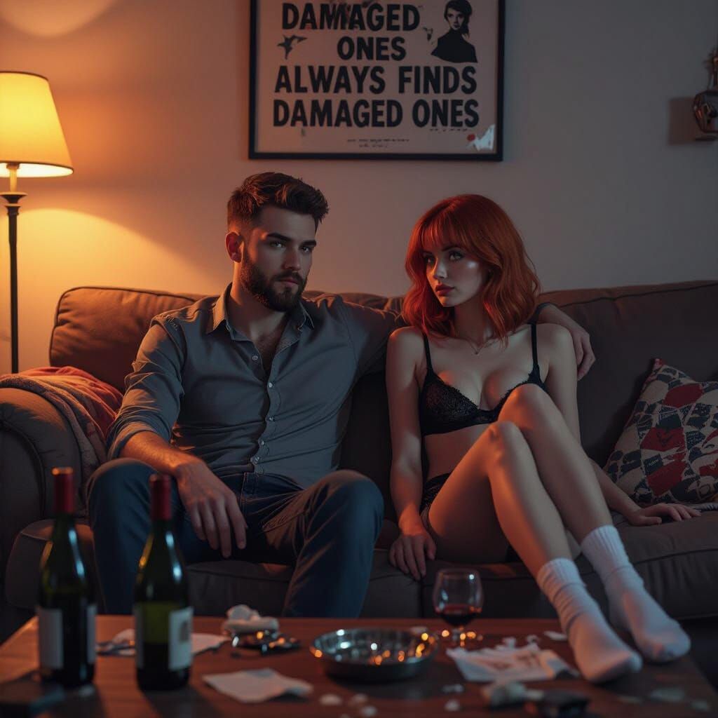 This image shows a man and woman in a dimly lit living room, sharing eye contact amidst signs of disarray. The scene is rendered with realistic tones and evokes a moody, intimate atmosphere.