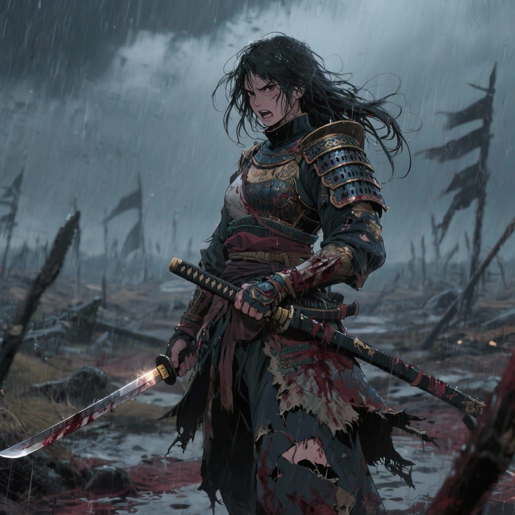 This image shows a battle-worn samurai woman standing defiantly on a rain-soaked battlefield. The artwork features a cel-shaded anime aesthetic with vibrant colors and dramatic lighting, creating an epic and cinematic atmosphere.